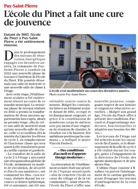 Dans le prolongement des travaux de rénovation énergétique engagés ces dernières années, la commune de Puy-Saint-Pierre a conduit en 2025 une nouvelle phase de travaux d’ampleur à l’intérieur de l’école du Pinet. Avec cette étape décisive, l’établissement aura été entièrement rénové au cours du mandat municipal.