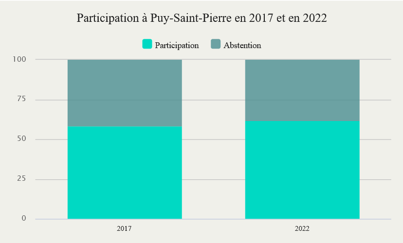À l'occasion du second tour des élections législatives 2022, le député sortant Joel GIRAUD (ENS) se classe en tête à Puy-Saint-Pierre et reçoit 52,5 % des votes exprimés. La candidate Nouvelle union populaire écologique et sociale (NUPES) Capucine MOUNAL remporte l'approbation de 47,5 % des votants s'étant exprimés.