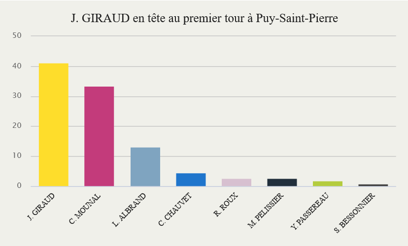 À l'occasion du premier tour des élections législatives 2022, le député ENS sortant Joel GIRAUD se classe à la première place à Puy-Saint-Pierre et remporte l'approbation de 41,2 % des votants s'étant exprimés.
