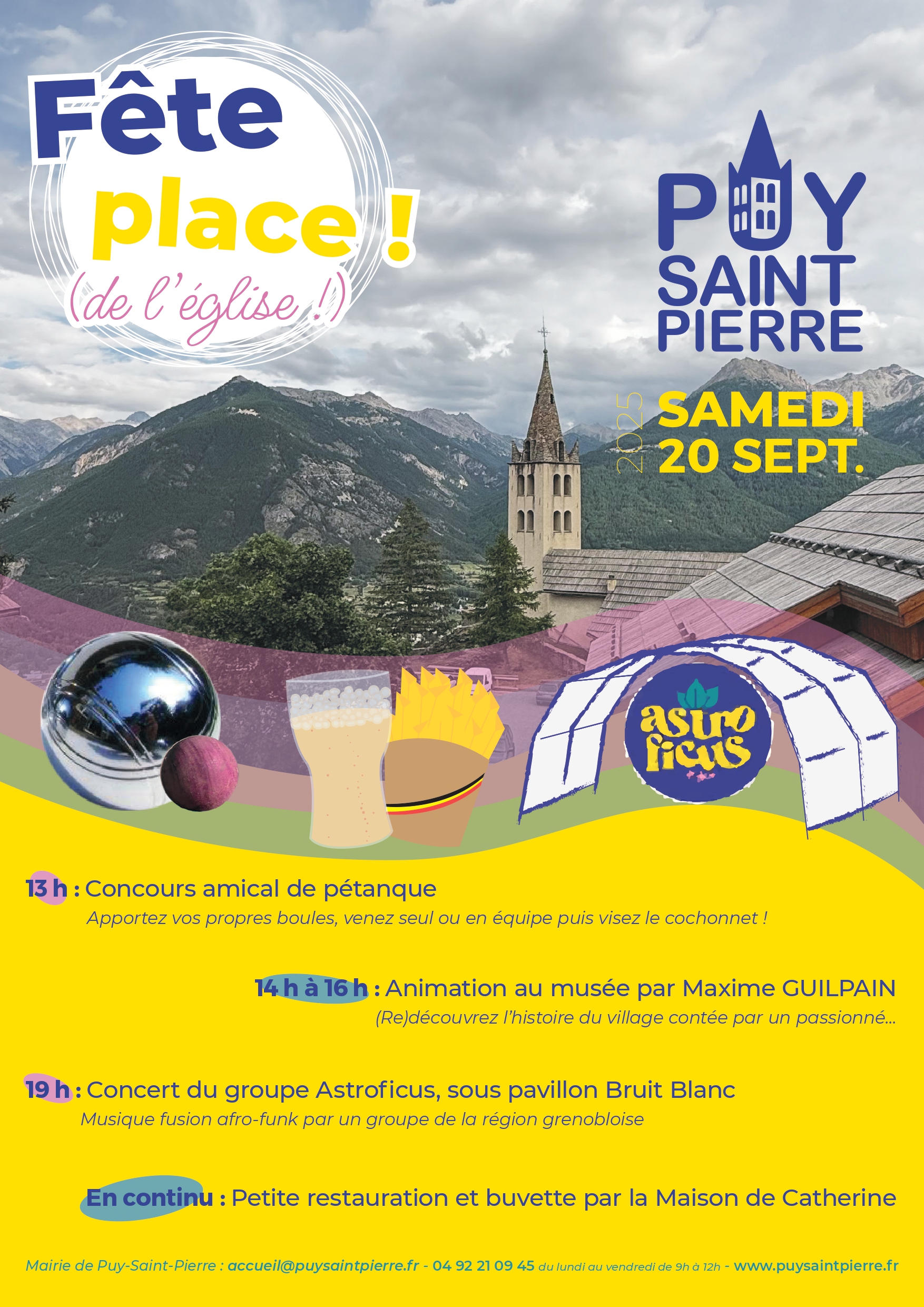 La commune de Puy-Saint-Pierre organise une journée festive et conviviale le samedi 20 septembre 2025, dès 13h, sur la place de l'Église, pour valoriser cet espace public exceptionnel !